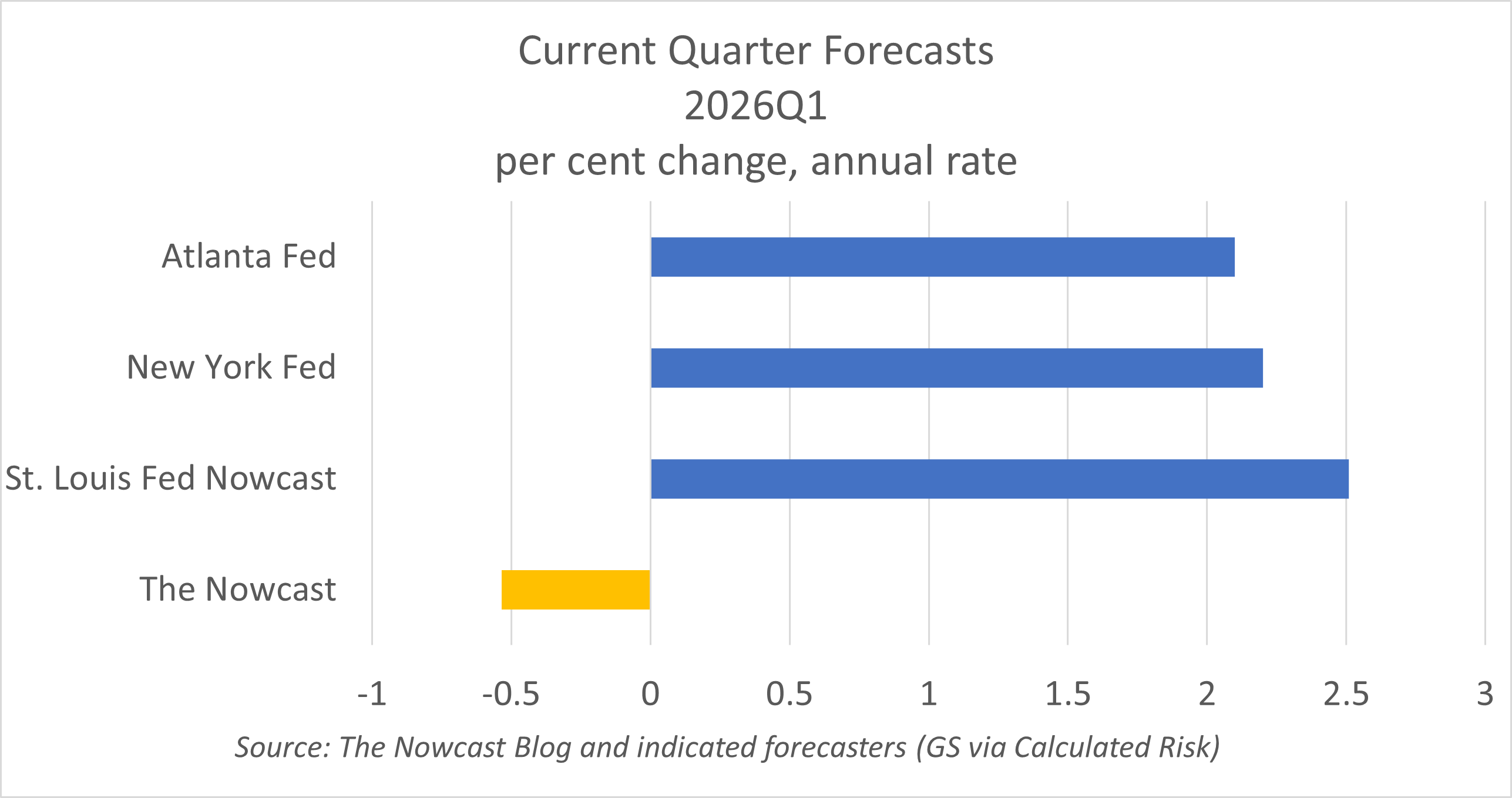 Last week, I stepped on my own model’s forecast by explaining why it was probably too pessimistic. This week’s unchanged model forecast (-0.5% real GDP growth in Q1) continues to exclude some important positive factors, like the snap back in government spending. But two things now make the case for pessimism stronger.